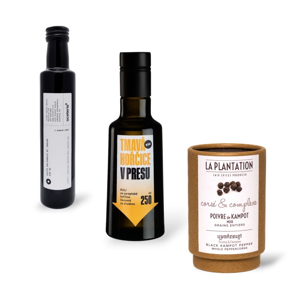 Gurmánská sada na salát - hořčičný olej, balsamico a Kampotský pepř
