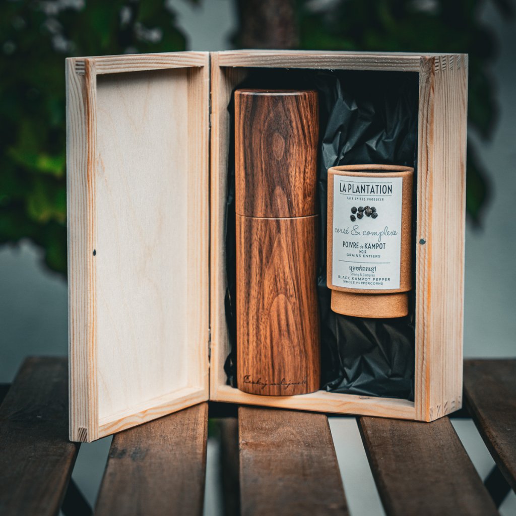 Dárková sada Český mlýnek ořešák 20cm s černým Kampotským pepřem, dřevěný box