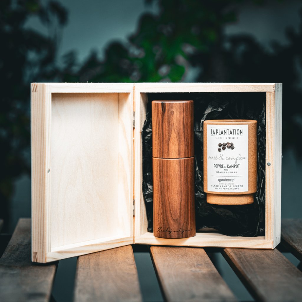 Dárková sada s luxusním mlýnkem z ořešáku s černým Kampotským pepřem, dřevěný box