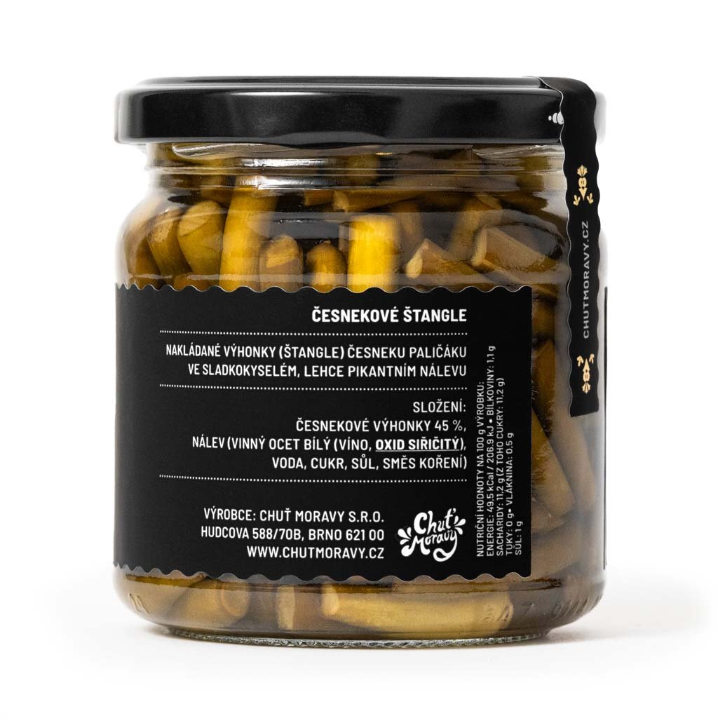 Jako česnekové štangle jsme nazvali mladé výhonky česneku paličáku naložené ve skladkokyselém kořeněném nálevu. Tato dobrota není úplně neznámá a spousta hospodyň si v minulosti podobným způsobem uchovávala česnekové výhonky jako vítanou přísadu do polévek, omáček, k masu nebo pomazánek. Jejich jemná, méně štiplavá česneková chuť byla vítanou změnou oproti ostrému česneku.