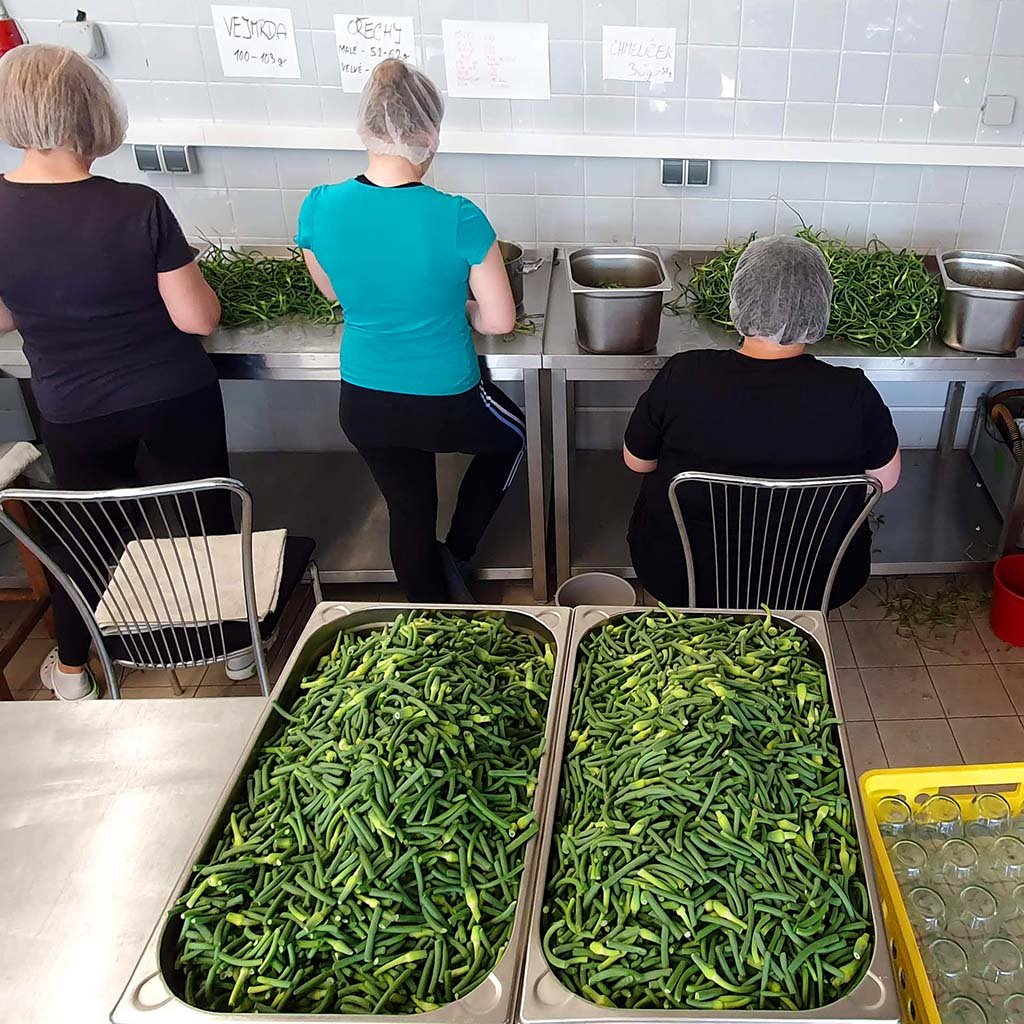 Po omytí výhonků, je potřebujeme naporcovat na kousky zhruba 4 - 5 cm dlouhé. Toto je nejnáročnější a nejpomalejší část celého procesu. Spousta rukou s nůžkami musí jeden výhonek po druhém pokrátit (4) na správný rozměr. Letos jsme prvně testovali i zlepšovák, tak abychom mohli zaráz zpracovat více výhonků a dá se říct, že fungoval, ale času jsme nakonec zas až tolik neušetřili. Výhonky jsou hodně pokroucené a manipulace s nimi je obtížná.