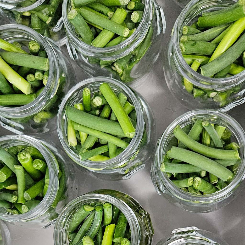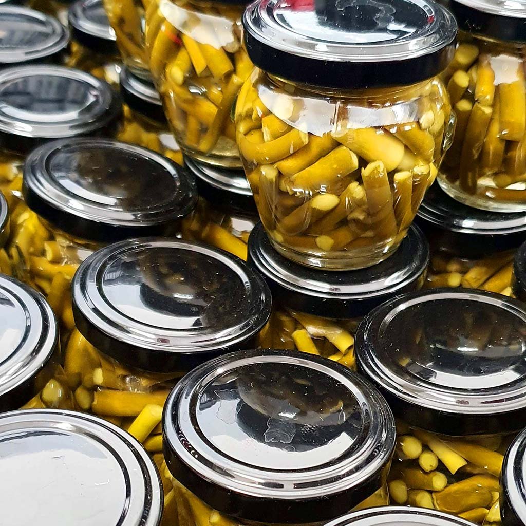 Nařezané kousky výhonků se následně plní do sklenic (5) na požadovanou hmotnost a nakonec zalévají připraveným lákem.(6) Po uzavření se sklenice ještě musí zapasterovat a označit etiketami.(7)